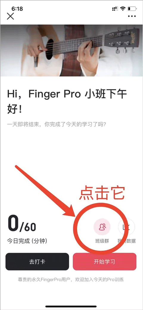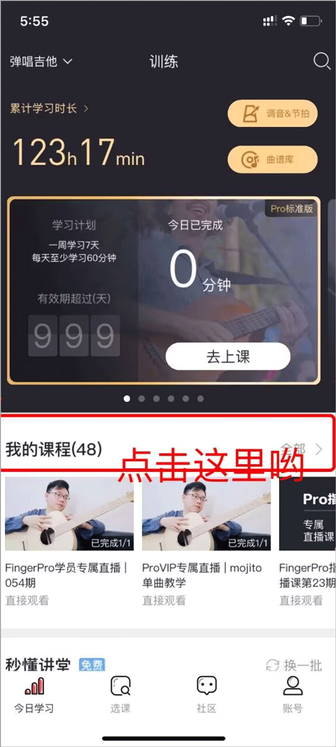观看路径:打开Finger吉他首页,点击[今日学习] - [去上课]。若文字说明不够直观,可参照以下操作图示。