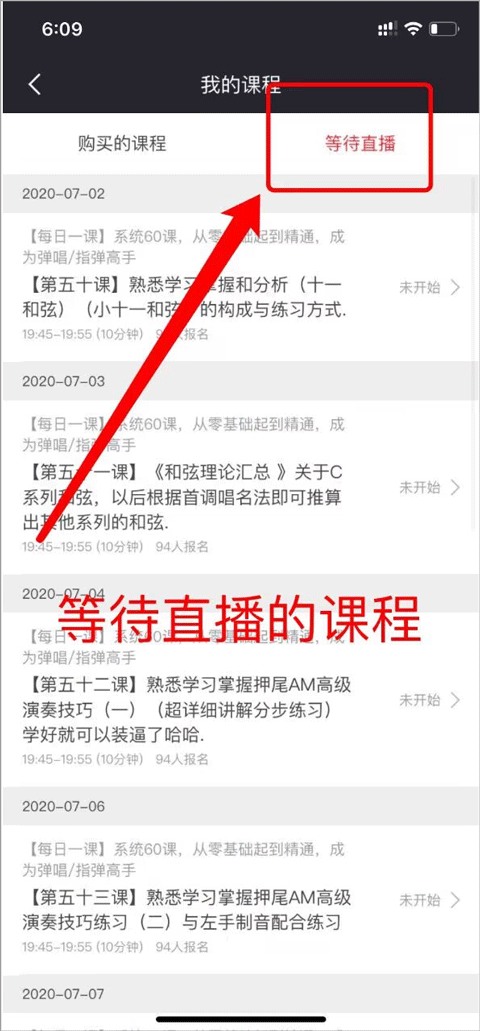 在[等待直播]页面查看即将开始的课程