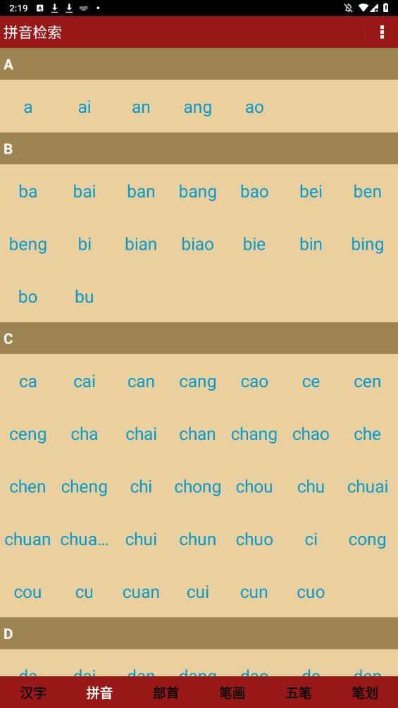 拼音和部首检索支持按首字母或部首笔画数进行筛选,提升查找效率。