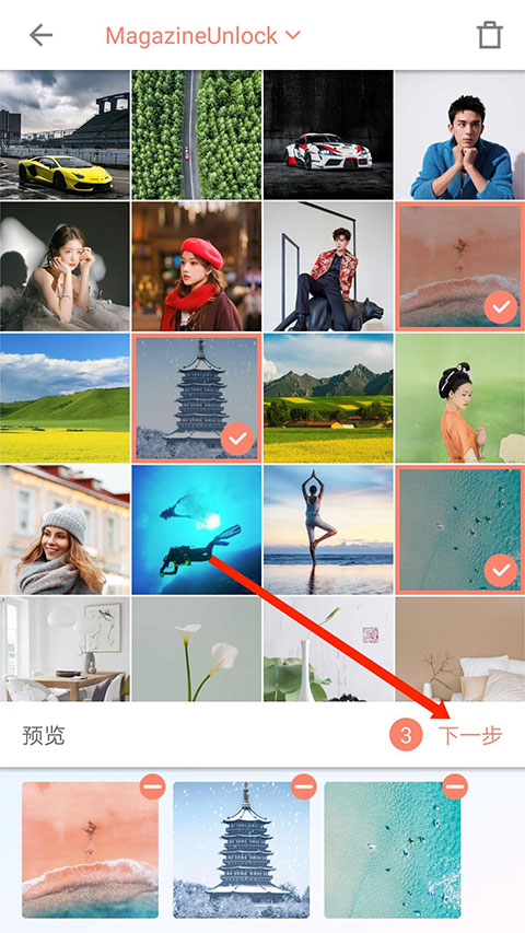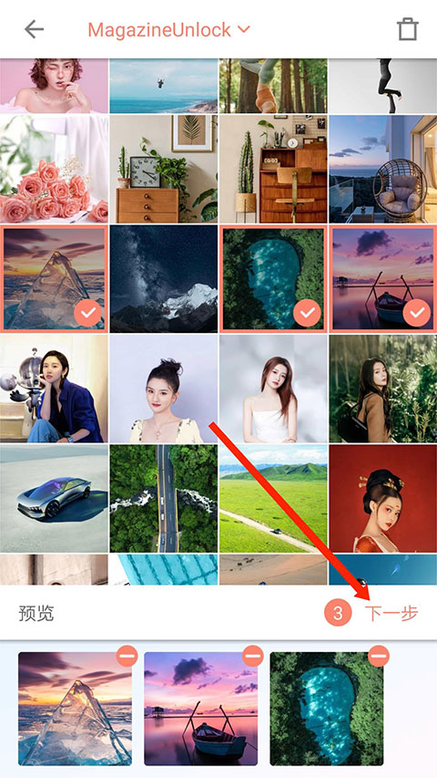进入照片选择界面,勾选所需图片后点击右下角“下一步”,