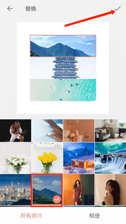 在替换页面中,勾选用于替代的新图片,点击右上角“打钩”确认,原图即被替换删除。