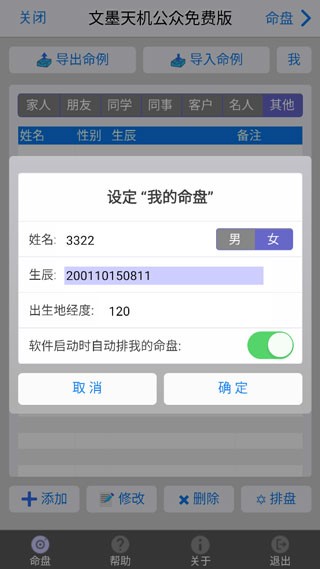 完成信息设置后,建议勾选“软件启动时自动排我的命盘”选项,并点击“确定”保存配置。